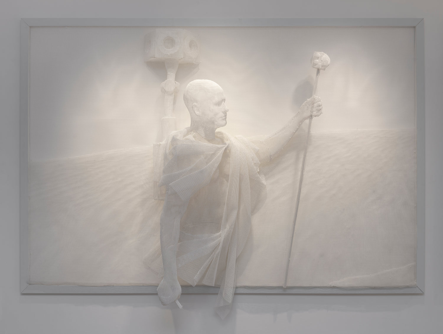 Recycle Group explore the realm of virtual reality using both recycled imagery and materials, their work aiming to bridge incompatible subjects such as the classical with the contemporary. Recycle Group transforms classical heritage into futuristic narratives — merging sculpture, digital code, and augmented reality. The work is made from thermoformed plastic mesh that forms part of their deep reflection on the impact of new technologies—particularly artificial intelligence—on our lives. Here, the duo incisively explores the theme of humans being replaced by machines in the professional world, a reality that is becoming increasingly prevalent in contemporary societies.