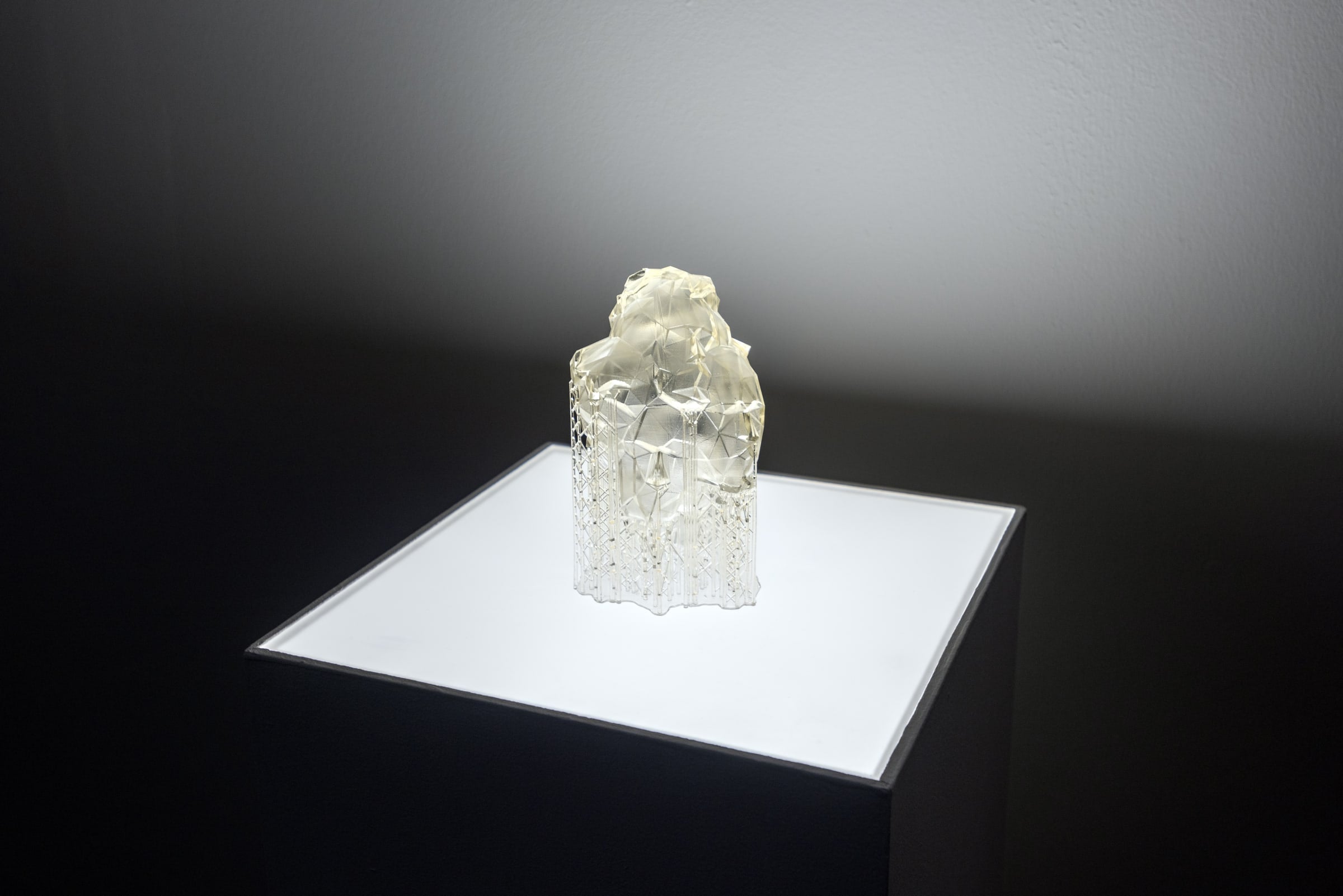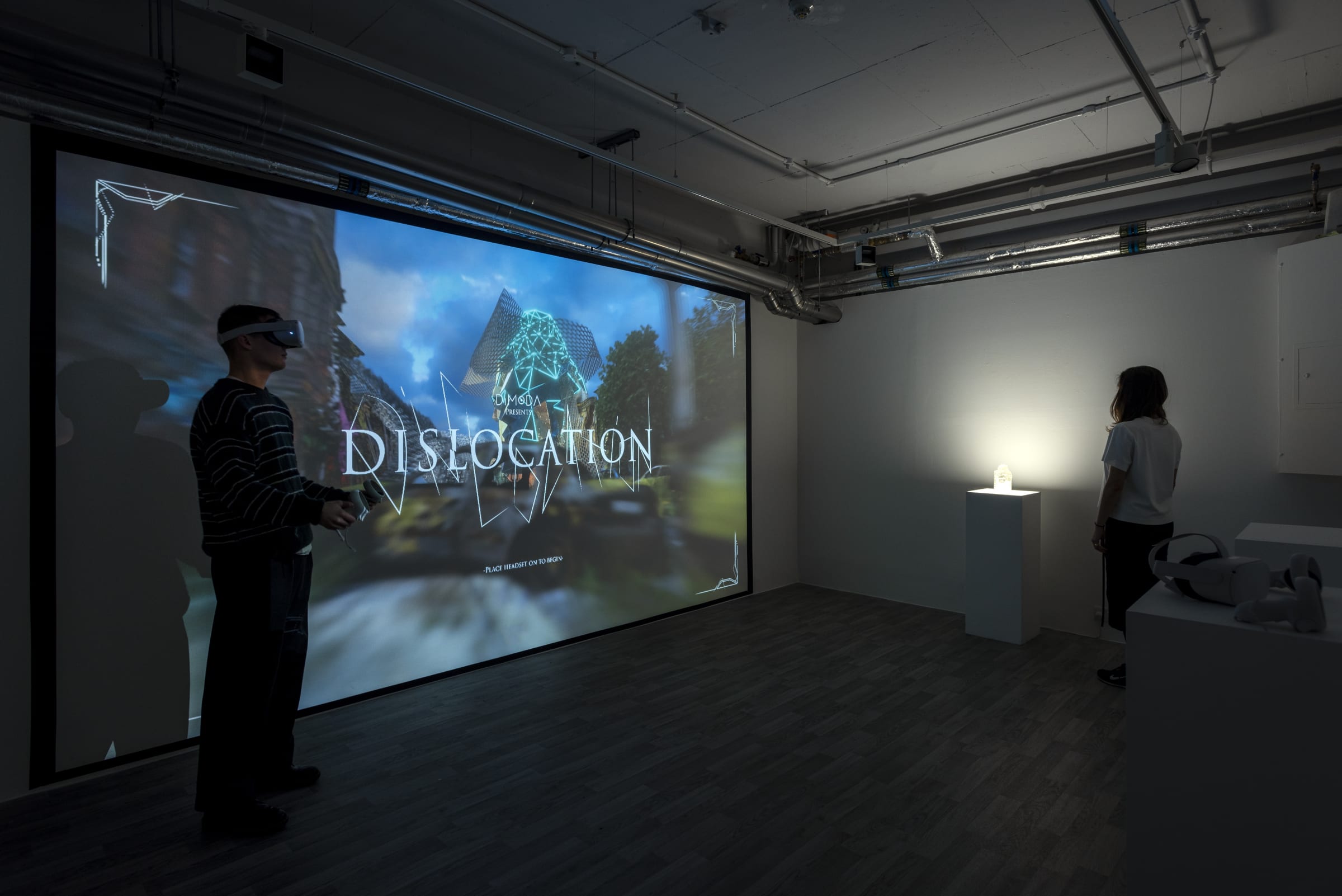 The artworks encountered by visitors in the DiMoDA 4.0 museum architecture entail experiences from the concrete to the abstract and the natural or urban environment to the spiritual. In Ricardo Miranda Zuniga's Desplazados viewers can navigate a virtual reality version of New York City's Lower East Side, where they encounter, in the form of audio interviews, the personal accounts of inhabitants affected by gentrification in a maze of alleyways. Zooming out to a global level, Tamiko Thiel's Atmos Sphaerae takes viewers on an abstracted visual voyage through the evolution of the earth and creation myths, from the big bang andcosmic egg (as the soul of the primeval waters out of which creation arose) to protoplanetary gases and the earliest life forms. The evolution culminates in scenery of oil rigs and flare towers burning off methane and an atmosphere of water vapor and greenhouse gas, a warning of the potential outcome of global warming and extinction of most life forms. Banz & Bowinkel's work The Grid transports viewers into the consciousness of a computer where electricity flows through transistors and creates a world of binary operations. Humanoid figures with oily skins, wearing masks made out of 3D geometries based on Internet images, wander through the space under gigantic transmitters suspended from the ceiling, engaging visitors in a series of interactions that reflect on the distortions of perception in a machinic world.