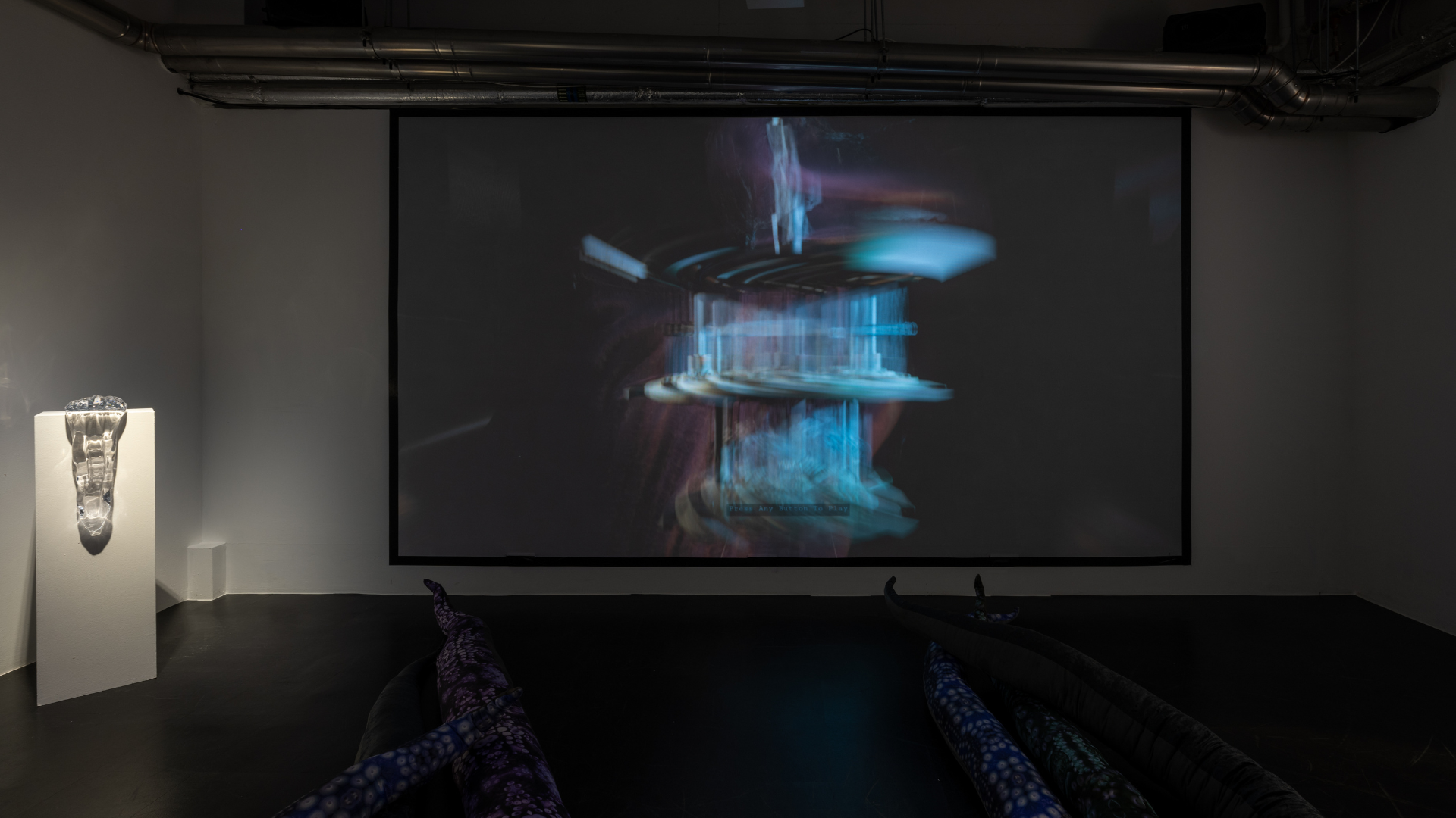 These sculptures explore a state of in-between, where the glass assumes a slimy quality, neither solid nor liquid. Slime is a recurring motif in Heaney’s practice, symbolising the unstable nature of reality and the monstrous nature of self. It is also an entangling substance between all life forms – there is no form of multicellular life that does not contain some sort of slime, mucus, or viscous gel. In combination with projected video Heaney sees her clear glass sculptures as petri dishes for entangling images of the environment. By testing the physical limitations of glass, Heaney reflects on whether the fantastical world described by Lewis Carroll in Through the Looking-Glass (1871) where everything is upside down – even logic – could equally be ascribed to the quantum world?