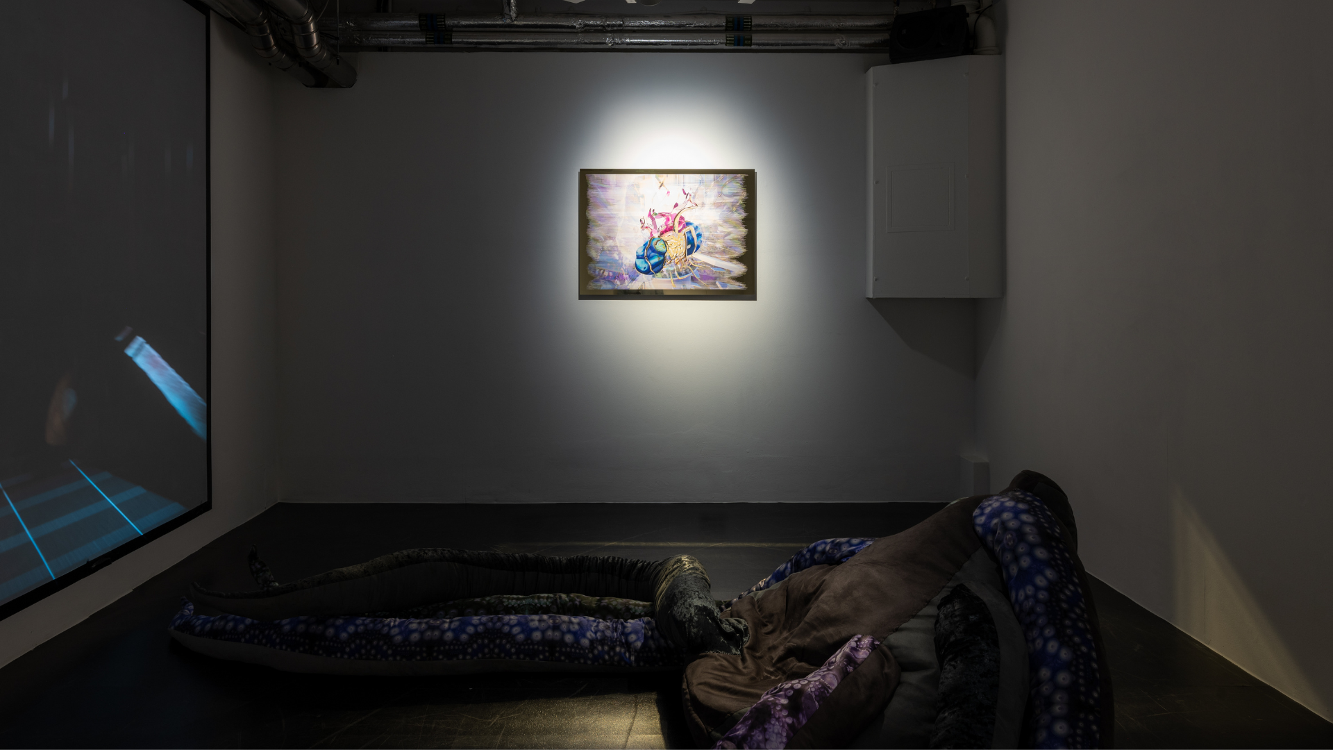 On view in the Project Space is a new unique print titled Ent-er the quantum cyborg (2024) in which Heaney further explores the entangled hybrid form she has brought to life in Regent’s Park. Digitally printed on a mirrored gold Dibond aluminium panel – a material the artist has utilised since 2022 – the work layers quantum-edited textures with fragments of the animated AR experience, and images of the Q-borg itself. The amalgamation of bodies combines queered references to sculptural depictions from antiquity, such as the Laocoön Group, reclining figures in Renaissance painting such as Titian’s Venus of Urbino, and the small Paleolithic figure the Venus of Willendorf. Biomorphic blue flesh oozes from the industrial chamber of a machine, and metallic tentacles, partly inspired by the gold plating of quantum computers, writhe and pulsate.