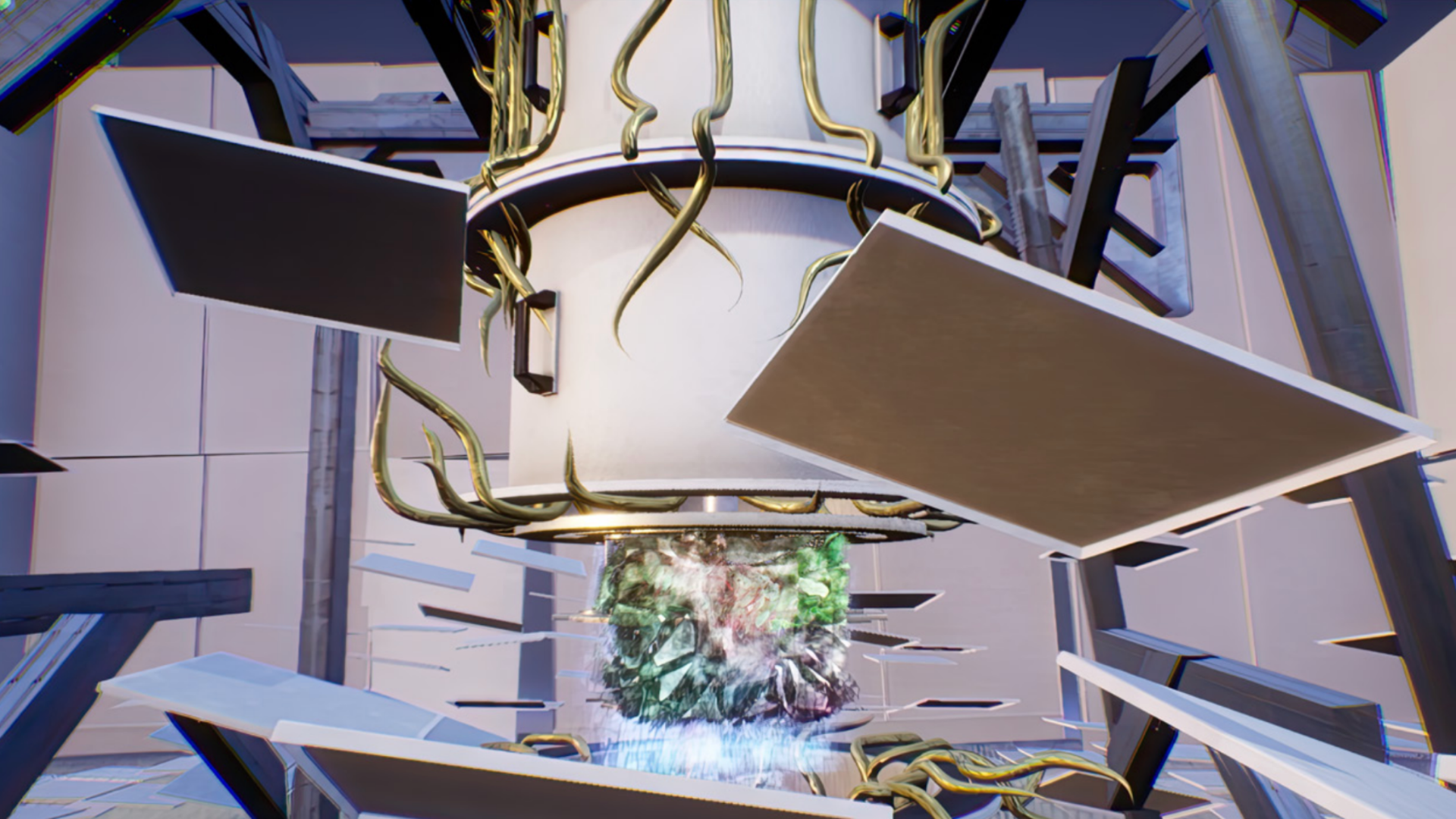 Connecting to the AR in Regent’s Park, visitors can also encounter Ent- (Many Paths Version) (2022) in which one navigates through quantum materiality using a computer game controller. Fundamental to Heaney’s Ent- project is the notion of quantum superposition, or “the ability for one thing to be in two or more possibilities at the same time”. It is these parallel states which lend quantum technology speeds that exponentially surpass the digital. Pursued intensively by governments and big tech companies, quantum’s vast computational ability is set to impact our lives dramatically in the near future. Ent- (Many Paths Version) invites audiences to dip their toe into the quantum-age.
