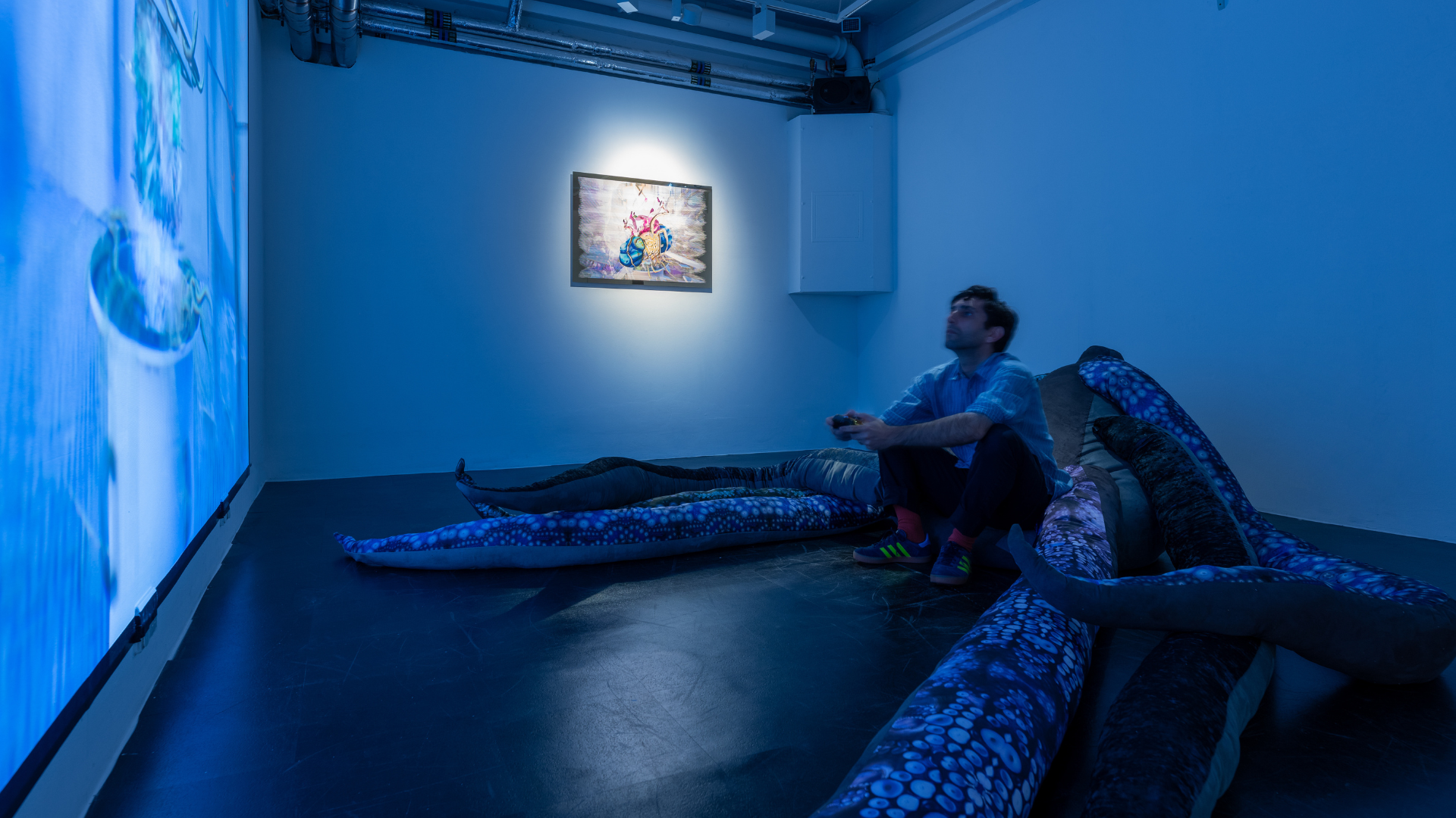 Installed in Regent’s Park, Ent- (non-earthly delights) (2024) is a dramatic blue-bodied and golden-tentacled ‘Q-borg’ (quantum cyborg) accompanied by two augmented reality (AR) experiences. It is the latest chapter in Heaney’s ongoing multimedia project Ent- which uses Hieronymus Bosch’s painted triptych The Garden of Earthly Delights (c.1490 –1500) as a prism through which to highlight the potentials and pitfalls of quantum technologies.