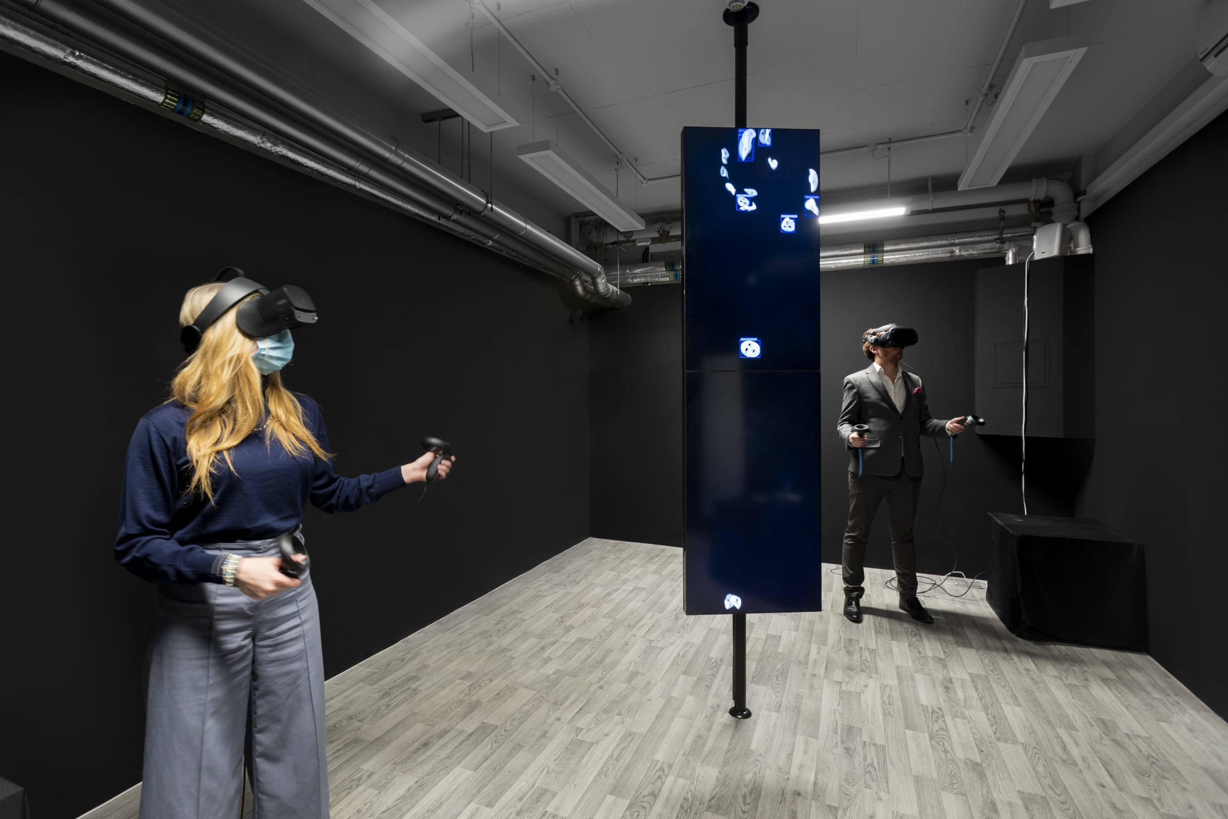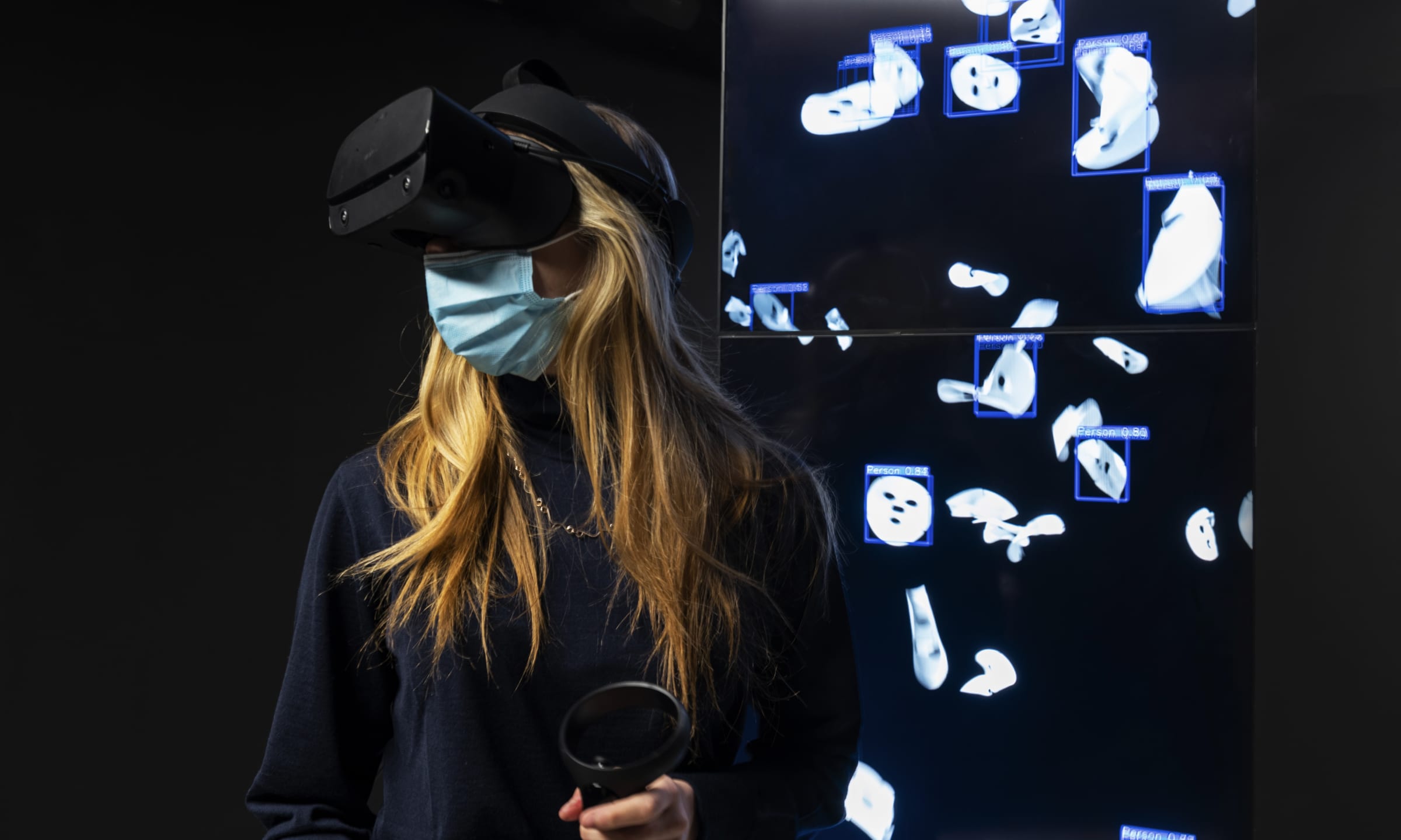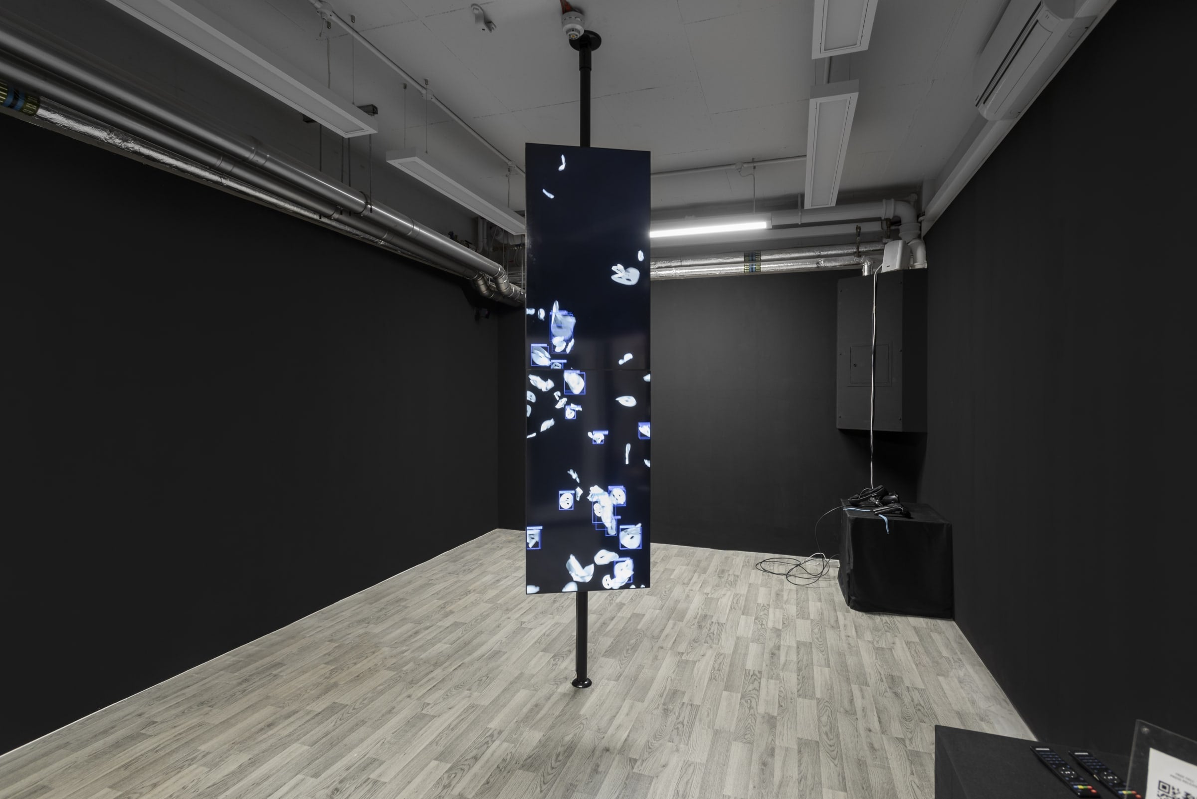 Another layer in work consists of a computer vision recognition system that surveys and detects moving images. The facial recognition system identifies whether the image of each falling sheet mask matches the features of the human face. The floating values between 0 and 1 in the blue bounding box represent the approximation value of “human” identified by the machine compared to “real human.”