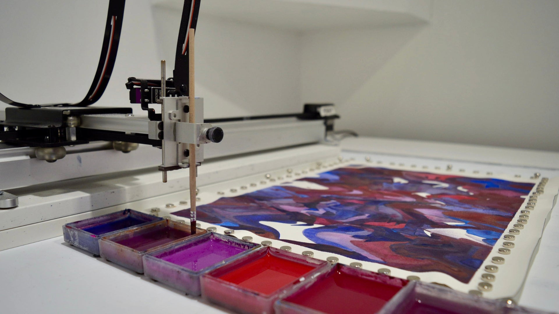 Plotter-rendered generative painting Python, mixed water-medium on cotton paper