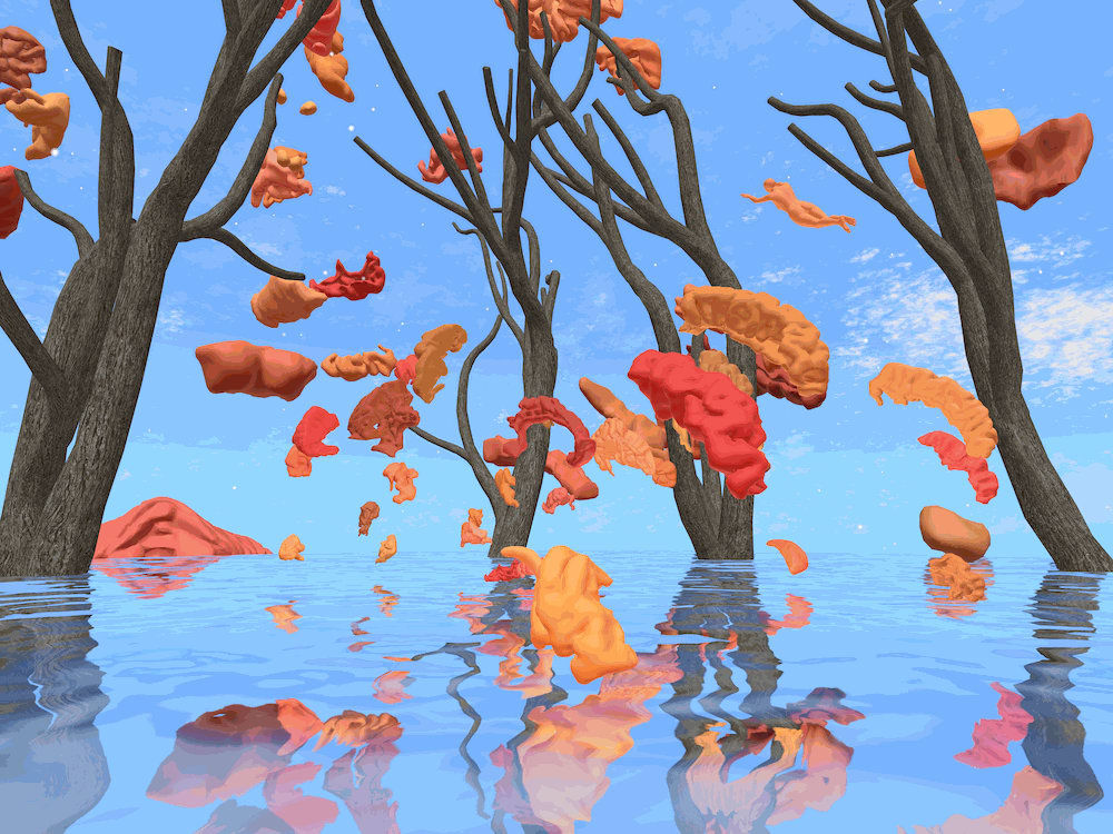 Continuing my interest in developing an aesthetic unique to the medium of VR, some components in the work are generative and will subtly change each time you try the experience – brain colors shift, tree shapes change, the “mind” follows different paths and viewer interaction creates variations in audio and animation. The model of the brain originates from MRI brain scans, while other elements – the sky, the water, the generic female form – were found freely available on the web.