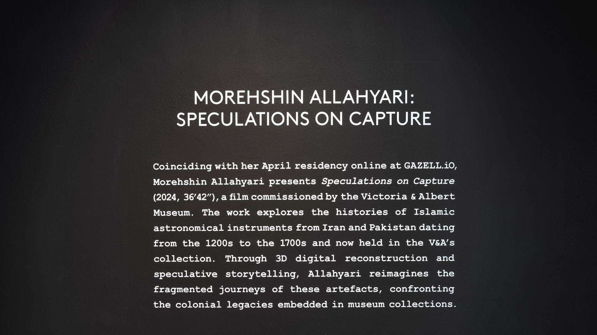 GAZELL.iO is delighted to present Morehshin Allahyari in our Project Space, coinciding with her April residency as our artist-in-residence. The exhibition features her latest work, Speculations on Capture (2024), a newly commissioned piece recently showcased at the Victoria and Albert Museum (V&A) in London.