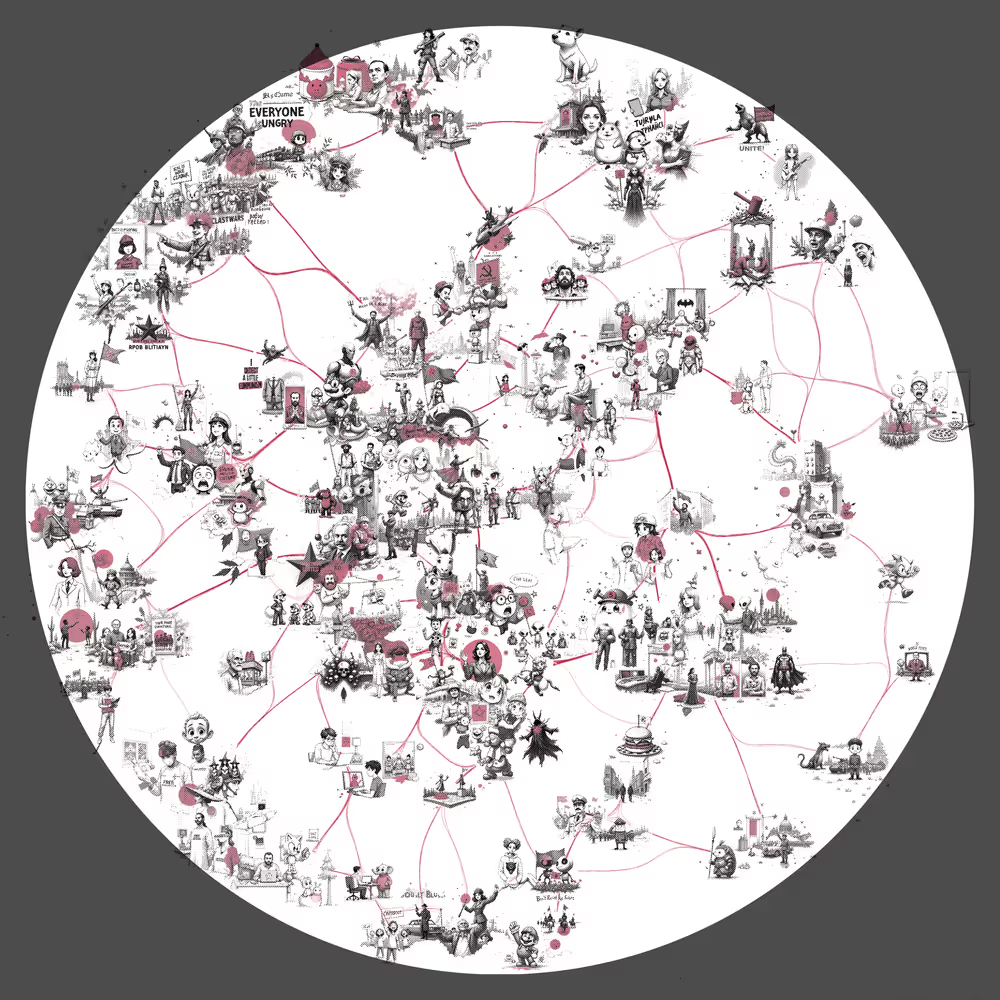 A collage consisting of 250 individual contexts activating this latent in related clusters, with strongest activations at the center. The red color highlights the semantically relevant parts of the image according to the LLM.